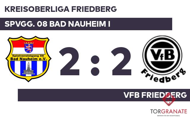 Maher Al Hassan brachte den VfB Friedberg in der 17. Minute ins Hintertreffen. Kurz vor dem Pfiff zur Halbzeit machte Salvatore Russo das 2:0 zugunsten der Spvgg. 08 Bad Nauheim I (42.). Mit der Führung für die Heimmannschaft ging es in die Kabine. Zum Seitenwechsel ersetzte Pavel Valkov vom VfB Friedberg seinen Teamkameraden Khalid Ramze. Dominique Ware schlug doppelt zu und glich damit für den VfB aus (47./62.). Alles sprach für einen Sieg der Spvgg. Bad Nauheim, doch am Ende wurde das Aufbäumen des VfB Friedberg noch belohnt, und die Teams trennten sich mit einem Remis voneinander.