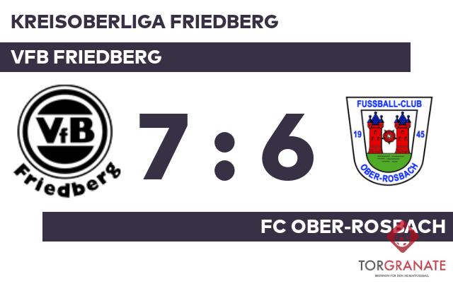 Das erste Tor des Spiels ging an den VfB Friedberg. Allerdings gelang dies nur mithilfe des FC Ober-Rosbach: 1:0 für den VfB Friedberg durch ein Eigentor in der dritten Minute. Lange währte die Freude des VfB Friedberg nicht, denn schon in der vierten Minute schoss Niklas Corthaus den Ausgleichstreffer für den FC Ober-Rosbach. Pasqualino Balenzano versenkte die Kugel zum 2:1 (7.). David Meyer ließ sich in der 19. Minute nicht zweimal bitten und verwertete zum 2:2 für den VfB Friedberg. Laurin Liebmann beförderte das Leder zum 3:2 des FC Ober-Rosbach in die Maschen (21.). Nach nur 22 Minuten verließ Alexander Clark vom Gast das Feld, Jens Paetzold kam in die Partie. In der 32. Minute war Meyer mit dem Ausgleich zum 3:3 zur Stelle. Damit schoss er bereits seinen zweiten Treffer! Für das 4:3 des FC Ober-Rosbach zeichnete Guenay Celil verantwortlich (39.). Der VfB Friedberg hatte sich schnell wieder gesammelt und erzielte in Person von Meyer den Ausgleich (42.). Zum Seitenwechsel hatte keine Mannschaft die Oberhand gewonnen. Unentschieden lautete der Zwischenstand. Mit einem Wechsel – Amadeo Cela kam für Jonas Kamphausen – startete der VfB Friedberg in Durchgang zwei. Die nächsten beiden Treffer waren einem Mann vorbehalten: Meyer schnürte einen Doppelpack (47./56.), sodass der VfB fortan mit 6:4 führte. Jordanis Triantafyllou war es, der in der 58. Minute das Spielgerät im Tor der Friedberger unterbrachte. Per Elfmeter erhöhte Celil in der 88. Minute seine Torausbeute an diesem Tag auf zwei Treffer – 6:6 für den FC Ober-Rosbach. Cela stellte für den VfB Friedberg im Schlussakt den Führungstreffer sicher (90.). Letztlich nahm das Heimteam gegen den direkten Abstiegskonkurrenten wichtige Punkte mit und trug einen Sieg davon.