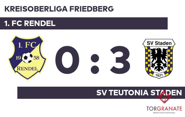 Torlos ging es nach dem Halbzeitpfiff in die Kabinen. Otto Weber brachte den SV Teutonia Staden in der 48. Minute in Front. Gleich drei Wechsel nahm der 1. FC Rendel in der 70. Minute vor. Alexander Stanzel, Louis Kalbhenn und Robin Pierce verließen das Feld für Marc Stoppany, Christian Opper und Kevin Burzig. David Richter schoss die Kugel zum 2:0 für den SV Teutonia Staden über die Linie (75.). Yannick Schichtel stellte schließlich in der 80. Minute den 3:0-Sieg für den Gast sicher. Nach der Beendigung des Spiels durch Referee Bernd Schmidt (Nidda) feierte der SV Teutonia Staden einen dreifachen Punktgewinn gegen den 1. FC Rendel.