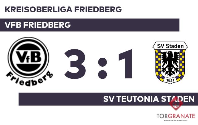 Othmane Louaddi brachte den SV Teutonia Staden in der neunten Minute ins Hintertreffen. Yannick Schichtel nutzte die Chance für die Gäste und beförderte in der 24. Minute das Leder zum 1:1 ins Netz. Bis zur Pause fiel kein weiteres Tor, sodass das Ergebnis noch Bestand hatte, als sich die Teams in die Pause verabschiedeten. Radoslav Rusev verwandelte in der 49. Minute einen Elfmeter und brachte dem VfB Friedberg die 2:1-Führung. Kurz vor Ultimo war noch Waldemar Patzwald zur Stelle und zeichnete für das dritte Tor des VfB verantwortlich (84.). Mit dem Schlusspfiff durch den Unparteiischen Moritz Mohr (Wetzlar) siegten die Friedberger gegen den SV Teutonia Staden.