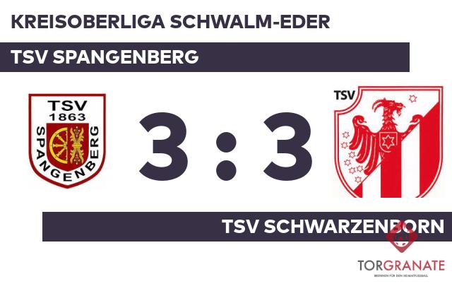 Gunter Eyring brachte den TSV Schwarzenborn in der 26. Minute nach vorn. Für das erste Tor des TSV Spangenberg war Dominik Uhl verantwortlich, der in der 33. Minute das 1:1 besorgte. Denis Boedicker verwandelte in der 35. Minute einen Elfmeter und brachte der Heimmannschaft die 2:1-Führung. Zur Pause behielt der TSV Spangenberg die Nase knapp vorn. In Durchgang zwei lief Gernot Mook anstelle von Jannik Elcik für den TSV Schwarzenborn auf. Christian Schützeberg erhöhte für den TSV Spangenberg auf 3:1 (59.). Mit einem Elfmeter von Luca Eckhardt kam der TSV Schwarzenborn noch einmal ran (74.). In der 82. Minute brachte Axel Richardt den Ball im Netz des TSV Spangenberg unter. Schließlich gingen der TSV Spangenberg und der TSV Schwarzenborn mit einer Punkteteilung auseinander.