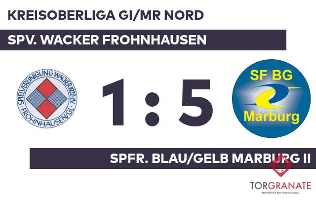 Für den Führungstreffer der Spfr. Blau/Gelb Marburg II zeichnete Leon Li-Yang Shen verantwortlich (21.). Bevor es in die Pause ging, hatte Jan Obermann noch das 2:0 der Gäste parat (43.). Weitere Tore blieben bis zum Pfiff des Schiedsrichters aus. Somit ging es mit einem unveränderten Stand in die Halbzeitpause. Jan Niklas Heck schoss für die Spv. Wacker Frohnhausen in der 46. Minute das erste Tor. Edwin Schoch trug sich in der 53. Spielminute in die Torschützenliste ein. Die SF/BG Marburg II baute den Vorsprung mit der Hilfe des Gegners weiter aus: 4:1 für die Spfr. Blau/Gelb Marburg II durch ein Eigentor der Spv. Frohnhausen in der 64. Minute. Eigentlich war die Spv. Wacker Frohnhausen schon geschlagen, als Jakob-Bernard Nordlohne das Leder zum 1:5 über die Linie beförderte (69.). Letztlich fuhr die SF/BG Marburg II einen souveränen Erfolg ein, dessen Grundstein im ersten Spielabschnitt gelegt worden war.