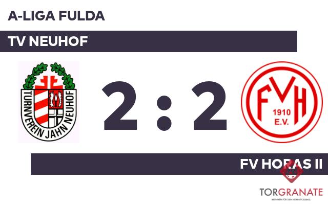 Das 1:0 in der zehnten Minute brachte den FV Horas II vermeintlich auf die Siegerstraße. Thomas Drmic glich nur wenig später für den TV Neuhof aus (11.). Nur eine Minute später erzielte der FV Horas II die 2:1-Führung. Der Ausgleich gelang Drmic, indem er eine Vorlage von Sandro Möller verwertete (37.). Zur Halbzeit war die Partie noch vollkommen offen. Remis lautete das Zwischenresultat. Schließlich bleibt folgendes Fazit: Während Durchgang eins einem Wechselbad der Gefühle gleichkam, war die zweite Hälfte dagegen ärmer an Höhepunkten und es fielen keine weiteren Treffer. Am Ende gingen die Teams mit einer Punkteteilung auseinander.