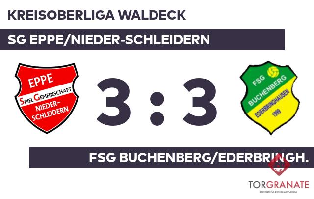Lars Dohle beförderte das Leder zum 1:0 von Eppe/Ndr-Schleidern in die Maschen (13.). Die passende Antwort hatte Tobias Materna parat, als er in der 19. Minute zum Ausgleich traf. Nach nur 29 Minuten verließ Jan Leyhe von Buchenb./Ederbr. das Feld, Marvin Brussmann kam in die Partie. Sven Reppert nutzte die Chance für die SG Eppe/Nieder-Schleidern und beförderte in der 36. Minute das Leder zum 2:1 ins Netz. Ein Tor auf Seiten des Gastgebers machte zur Pause den Unterschied zwischen den beiden Mannschaften aus. In Durchgang zwei lief Julian Thomas anstelle von Lars Vahland für Eppe/Ndr-Schleidern auf. Hendrik Gross schockte die SG Eppe/Nieder-Schleidern und drehte die Partie mit seinem Doppelpack für die FSG Buchenberg/Ederbringh. (47./58.). In der 83. Minute sicherte Dohle seiner Mannschaft mit dem Ausgleich zum 3:3 das Unentschieden. Damit schoss er bereits seinen zweiten Treffer. Am Ende stand ein Teilerfolg für beide Mannschaften. Eppe/Ndr-Schleidern und Buchenb./Ederbr. spielten unentschieden.