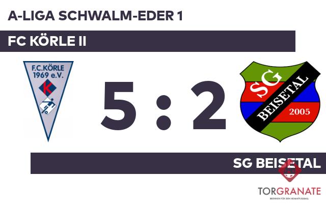 Die SG Beisetal geriet schon in der neunten Minute in Rückstand, als Till Willi Steyer das schnelle 1:0 für den FC Körle II erzielte. Suleiman Khalil beförderte das Leder zum 1:1 der SG Beisetal in die Maschen (36.). Zum Seitenwechsel hatte keine Mannschaft die Oberhand gewonnen. Unentschieden lautete der Zwischenstand. Nicolas Schirok trug sich in der 53. Spielminute in die Torschützenliste ein. Daniel Schwendich erhöhte für den FC Körle II auf 3:1 (60.). Marloor Kämpffer verkürzte für die SG Beisetal später in der 71. Minute auf 2:3. Doppelpack für den FC Körle II: Nach seinem ersten Tor (75.) markierte Philipp Blumenstein wenig später seinen zweiten Treffer (76.). Am Ende stand die Heimmannschaft als Sieger da und behielt die drei Punkte verdient zu Hause.