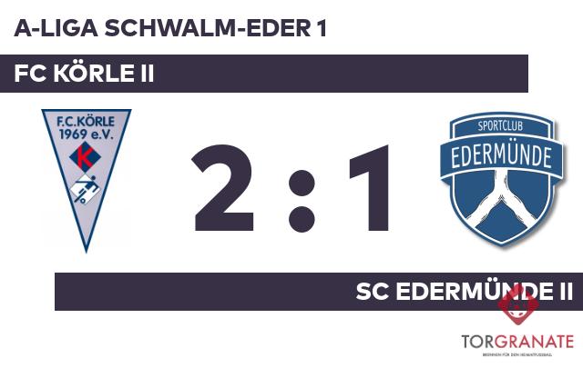 Für den Führungstreffer des SC Edermünde II zeichnete Florian Rupp verantwortlich (32.). Zur Pause behielt der Gast die Nase knapp vorn. Mit einem Wechsel – Mohammad Al Kahery kam für Johannes Vaupel – startete der FC Körle II in Durchgang zwei. Das 1:1 des Heimteams stellte Marco Zaguridis sicher (85.). Dank eines Treffers von Al Kahery in der Schlussphase (90.) gelang es dem FC Körle II, die Führung einzufahren. Am Ende verbuchte der FC Körle II gegen den SC Edermünde II die maximale Punkteausbeute.