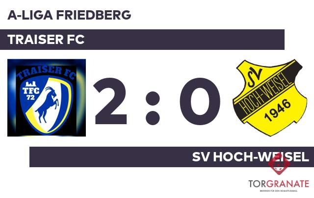 Der SV Hoch-Weisel geriet schon in der neunten Minute in Rückstand, als Robin Kasper das schnelle 1:0 für den Traiser FC erzielte. Torben Blendermann musste nach nur 20 Minuten vom Platz, für ihn spielte Dennis Seipel weiter. Im ersten Durchgang hatte der Traiser FC etwas mehr Zug zum Tor und ging mit einem knappen Vorsprung in die Kabine. Andreas Biehl stellte wenige Minuten vor dem Schlusspfiff den Stand von 2:0 für das Heimteam her (86.). Als Schiedsrichter Ahmet Karakus (Obertshausen) die Begegnung beim Stand von 2:0 letztlich abpfiff, hatte der Traiser FC die drei Zähler unter Dach und Fach.