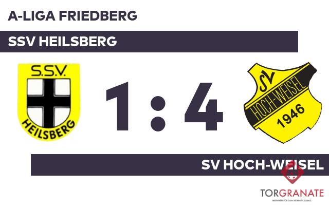 Zu Beginn der Begegnung neutralisierten sich beide Mannschaften so weit, dass sich keine von ihnen eine Torchance herausspielte. Nach nur 24 Minuten verließ Dennis Seipel vom SV Hoch-Weisel das Feld, Paulo Luis Sanches kam in die Partie. Für das 1:0 der Gäste zeichnete Dominic Nicolai verantwortlich (33.). Zur Pause behielt der SV Hoch-Weisel die Nase knapp vorn. Pierre Pfeil beförderte das Leder zum 2:0 des SV Hoch-Weisel über die Linie (66.). Gino Wirth witterte seine Chance und schoss den Ball zum 1:2 für den SSV Heilsberg ein (73.). In der 75. Minute brachte Sergej Tillmann das Netz für den SV Hoch-Weisel zum Zappeln. In der 77. Minute legte Tobias Oertner zum 4:1 zugunsten des SV Hoch-Weisel nach. Mit dem Ende der Spielzeit strich der SV Hoch-Weisel gegen den SSV Heilsberg die volle Ausbeute ein.