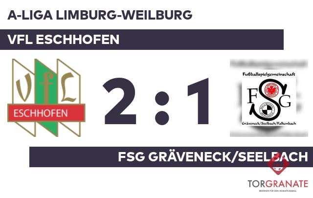 Durch einen Elfmeter von Binh Long Nguyen gelang dem Gräveneck/Seelbach das Führungstor. Komfortabel war die Pausenführung des Gasts nicht, aber immerhin ging die FSG Gräveneck/Seelbach mit einem Tor Vorsprung in die Umkleidekabinen. Das 1:1 des VfL Eschhofen bejubelte Marvin Gerhardt (66.). Dass das Heimteam in der Schlussphase auf den Sieg hoffte, war das Verdienst von Maurice Voss, der in der 73. Minute zur Stelle war. Nach Beendigung der zweiten Halbzeit hieß das Ergebnis 2:1 zugunsten des VfL Eschhofen.