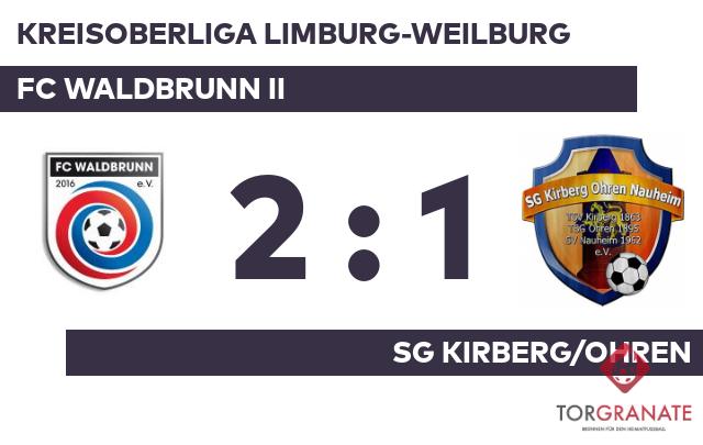 Lukas Rodrigues Tomas brachte den FC Waldbrunn II in der zwölften Minute nach vorn. Marius Mühl erhöhte den Vorsprung des Gastgebers nach 20 Minuten auf 2:0. In der Zeit bis zur Pause fiel kein weiteres Tor, es blieb bei der Führung für den FC Waldbrunn II. David Seibel war es, der in der 74. Minute das Spielgerät im Gehäuse des FC Waldbrunn II unterbrachte. Obwohl dem FC Waldbrunn II nach erfolgreicher erster Hälfte keine weiteren Tore gelangen, schaffte es die SG Kirberg/Ohren zugleich nicht, die Partie zu drehen. Sie endete mit 2:1.
