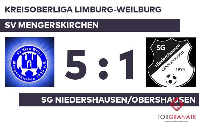 Für das erste Tor sorgte Bernhard Müller. In der zehnten Minute traf der Spieler der Gastgeber ins Schwarze. Der SV Mengerskirchen musste den Treffer von Florian Klaner zum 1:1 hinnehmen (28.). Der Treffer zum 2:1 sicherte dem SV Mengerskirchen nicht nur die Führung – es war auch bereits der zweite von Müller in diesem Spiel (35.). Zur Pause war der SV Mengerskirchen im Fahrwasser und verbuchte eine knappe Führung. Alexander Fröhlich schoss die Kugel zum 3:1 für den SV Mengerskirchen über die Linie (60.). Für das 4:1 zugunsten des SV Mengerskirchen sorgte dann kurz vor Schluss Santos Silva Maurizio Dos, der den SV Mengerskirchen und die Fans von einer Spitzenplatzierung träumen ließ (86.). Emil Drmaku gelang in den Schlussminuten noch ein weiterer Treffer für den SV Mengerskirchen (88.). Letztlich feierte der SV Mengerskirchen gegen die SG Niedershausen/Obershausen nach einer überzeugenden Darbietung einen verdienten Heimsieg.