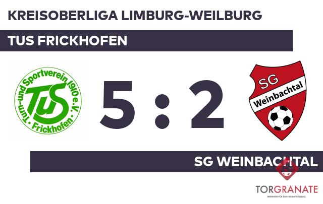 Kurz nach Spielbeginn schockte Can Cakal die SG Weinbachtal und traf für den TuS Frickhofen im Doppelpack (3./6.). In der 30. Minute schoss der TuS Frickhofen das letzte Tor dieser turbulenten Startphase. Das Heimteam gab in Durchgang eins klar den Ton an. Folgerichtig stand zur Pause eine klare Führung auf dem Zettel. In der Pause stellte die SG Weinbachtal personell um: Per Doppelwechsel kamen Gerrit Eichler und Sebastian Ketter auf den Platz und ersetzten Soeren Staudt und Serdar Sahin. In der 53. Minute brachte Jonathan Heil das Netz für den Gast zum Zappeln. Der vierte Streich des TuS Frickhofen war Leon Lukas Hanis vorbehalten (69.). Für das 5:2 zugunsten des TuS Frickhofen sorgte dann kurz vor Schluss Leon Lukas Hanis, der den TuS Frickhofen und die Fans von einer Spitzenplatzierung träumen ließ (89.). Schlussendlich verbuchte der TuS Frickhofen gegen die SG Weinbachtal einen überzeugenden Heimerfolg.
