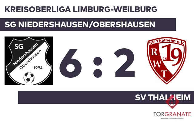 Die SG Niedersh./Obersh. erwischte einen Blitzstart ins Spiel. Florian Klaner traf in der sechsten Minute zur frühen Führung. Dennis Melbaum war es, der in der 20. Minute das Spielgerät im Gehäuse der Heimmannschaft unterbrachte. Mit einem Wechsel – Moritz Zipp kam für Marcel Becker – startete die SG Niedershausen/Obershausen in Durchgang zwei. Ohne weitere Tore ging es in die Pause. Mit einem schnellen Doppelpack (49./51.) zum 3:1 schockte David Fischer den SV Thalheim. Für endgültig klare Verhältnisse sorgten die Treffer von Felix Klaner (59.), Jan Zwitkowics (70.) und Florian Klaner (73.). Kurz vor Ultimo war noch Melbaum zur Stelle und zeichnete für das zweite Tor des SV Thalheim verantwortlich (89.). Am Ende kam die SG Niedersh./Obersh. gegen die Gäste zu einem verdienten Sieg.