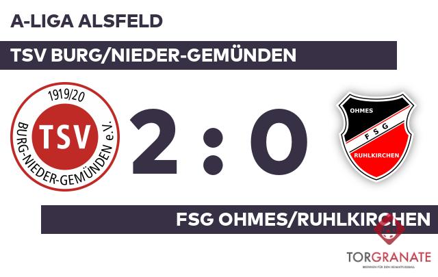 Die Ohmes/Ruhlkirchen geriet schon in der neunten Minute in Rückstand, als Rene Decher das schnelle 1:0 für den TSV Burg/Nieder-Gemünden erzielte. Tim Stoehr nutzte die Chance für den TSV B/N-Gemünden und beförderte in der 31. Minute das Leder zum 2:0 ins Netz. Mit der Führung für das Heimteam ging es in die Kabine. Bei der FSG Ohmes/Ruhlkirchen kam zu Beginn der zweiten Hälfte Jens Kraus für Christian Martin in die Partie. Der Halbzeitstand von 2:0 war letztlich auch das Endergebnis. Damit hatte sich der TSV Burg/Nieder-Gemünden bereits vor dem Pausenpfiff auf die Siegerstraße gebracht.