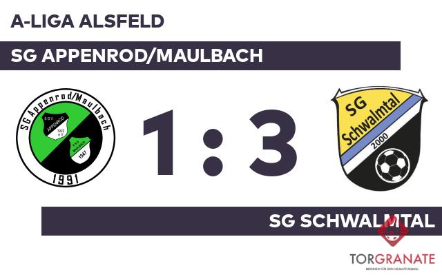Die SG Schwalmtal erwischte einen Blitzstart ins Spiel. Soeren Eidt traf in der sechsten Minute zur frühen Führung. Die SG Schwalmtal musste den Treffer von Ali Hamid zum 1:1 hinnehmen (24.). Weitere Tore blieben bis zum Pfiff des Schiedsrichters aus. Somit ging es mit einem unveränderten Stand in die Halbzeitpause. Christoph Welker brachte den Ball zum 2:1 zugunsten der SG Schwalmtal über die Linie (63.). Ehe der Abpfiff ertönte, war es Christian Ruhl, der das 3:1 aus Sicht der SG Schwalmtal perfekt machte (90.). Die 1:3-Heimniederlage der SG Appenrod/Maulbach war Realität, als der Unparteiische Berthold Galmarini (Petersberg) die Partie letztendlich abpfiff.