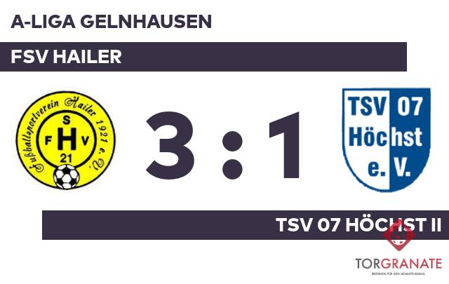 Auf die vermeintliche Siegerstraße brachte Marius Strobel sein Team in der zwölften Minute. Nach nur 26 Minuten verließ Piotr Majka vom TSV 07 Höchst II das Feld, Marco Schmehl kam in die Partie. Das 1:1 des FSV Hailer bejubelte Andrew Jordan Weber (37.). Zum Seitenwechsel hatte keine Mannschaft die Oberhand gewonnen. Unentschieden lautete der Zwischenstand. Weber brachte den TSV 07 Höchst II per Doppelschlag ins Hintertreffen, als er in der 51. und 59. Minute vollstreckte. Nach Beendigung der zweiten Halbzeit hieß das Ergebnis 3:1 zugunsten des FSV Hailer.