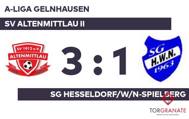 Der Unparteiische setzte mit dem Halbzeitpfiff dem torlosen Treiben auf dem Feld vorläufig ein Ende. In der Pause stellte der SV Altenmittlau II personell um: Per Doppelwechsel kamen Patrick Barthel und Andreas Herrman auf den Platz und ersetzten Benjamin Praus und Andreas Suchy. Samet Akbulut brachte die SG Hesseldorf/W/N-Spielberg in der 52. Spielminute in Führung. In der 60. Minute verwandelte Louis Daniel Hollander dann einen Elfmeter für den SV Altenmittlau II zum 1:1. Dass die Heimmannschaft in der Schlussphase auf den Sieg hoffte, war das Verdienst von Hannes Pawel, der in der 75. Minute zur Stelle war. Barthel versenkte die Kugel zum 3:1 für den SV Altenmittlau II (85.) Am Schluss gewann der SV Altenmittlau II gegen die SG Hesseldorf/W/N/S.