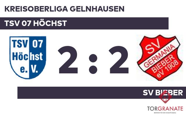 Der TSV 07 Höchst ging durch Manuel Basilio Tanzer in der 16. Minute in Führung. Für das erste Tor des SV Bieber war Jannik Meister verantwortlich, der in der 23. Minute das 1:1 besorgte. Zum Seitenwechsel hatte keine Mannschaft die Oberhand gewonnen. Unentschieden lautete der Zwischenstand. Mit einem Wechsel – Niklas Günther kam für David Schaefer – startete der TSV 07 Höchst in Durchgang zwei. Der SV Bieber musste den Treffer von Tim Fischer zum 2:1 hinnehmen (55.). Das 2:2 des SVB bejubelte Felix Beck (81.). Am Ende stand es zwischen dem TSV 07 Höchst und dem SV Bieber pari.