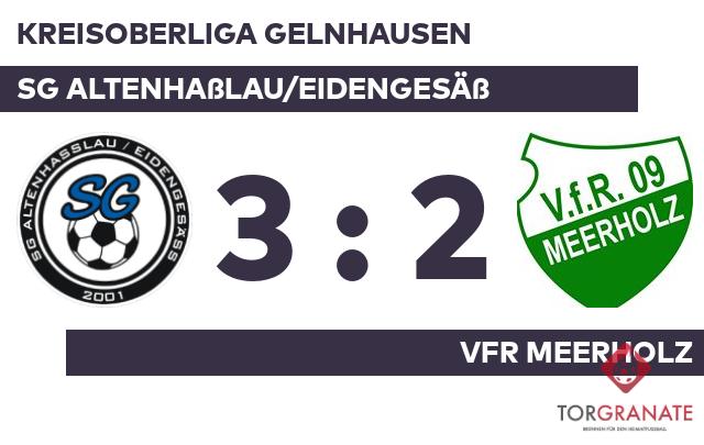 Zu Beginn der Begegnung neutralisierten sich beide Mannschaften so weit, dass sich keine von ihnen eine Torchance herausspielte. Der VfR Meerholz ging durch Kevin Koch in der 20. Minute in Führung. Nader Barhouche ließ sich in der 38. Minute nicht zweimal bitten und verwertete zum 1:1 für die SG Altenhaßlau/Eidengesäß. Ehe der Unparteiische Christian Maurice Graul (Alzenau) die Akteure zur Pause bat, erzielte Marco Link aufseiten der Zweier-Spielgemeinschaft das 2:1 (45.). Die Pausenführung des Gastgebers fiel knapp aus. In Durchgang zwei lief Christian Massaro anstelle von Dennis Jackel für den VfR Meerholz auf. Link schnürte mit seinem zweiten Treffer einen Doppelpack und brachte seine Mannschaft auf die Siegerstraße (55.). Mit einem Elfmeter von Tobias Eurich kam der VfR Meerholz noch einmal ran (67.). Nach der Beendigung des Spiels durch Schiedsrichter Christian Maurice Graul (Alzenau) feierte das Altenhaßlau/Eid. einen dreifachen Punktgewinn gegen den VfR Meerholz.