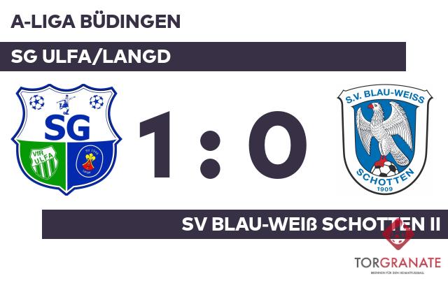 Für David Volpp war der Einsatz nach zwölf Minuten vorbei. Für ihn wurde Simon Fuchs eingewechselt. Beide Mannschaften starteten vorsichtig in das Spiel. Zu Torchancen gelangte in der Anfangsphase keine von beiden. Nach nur 22 Minuten verließ Nick Hasse von der SG Ulfa/Langd das Feld, Thim Fritz kam in die Partie. Im ersten Durchgang tasteten sich die beiden Mannschaften lediglich ab, Tore gab es nicht zu verzeichnen. Zum Mann des Spiels avancierte Jan Michael Döll, der für die SG Ulfa/Langd in der Schlussphase den Führungstreffer markierte (90.). Letzten Endes holte die SG Ulfa/Langd gegen den SV BW Schotten II drei Zähler.