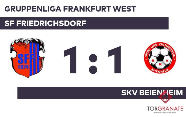 Durch einen Elfmeter von Ante Paradzik gelang dem SKV Beienheim das Führungstor. Kai Pulino schoss für die SF Friedrichsdorf in der 33. Minute das erste Tor. In der 34. Minute wechselten die Gastgeber Davor Babic für Mohamad Mouma ein, einen nominellen Verteidiger für einen anderen. Ohne weitere Tore ging es in die Pause. Auch in der zweiten Halbzeit gelang es der SF Friedrichsdorf nicht, aus dem Heimvorteil Kapital zu schlagen. So blieb es auch nach weiteren 45 Minuten beim 1:1-Remis.