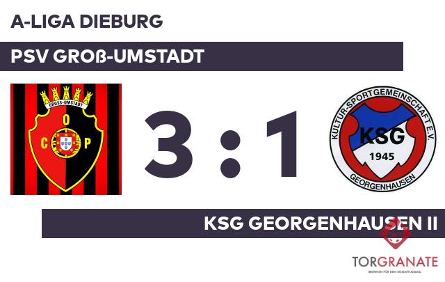 Andre Pereira da Costa brachte die KSG Georgenhausen II per Doppelschlag ins Hintertreffen, als er in der zwölften und 43. Minute vollstreckte. Luis Leao Ferreira musste nach nur 16 Minuten vom Platz, für ihn spielte Jose Miguel Abreu Coelho weiter. Nach nur 23 Minuten verließ Karan Jay Misra von der KSG Georgenhausen II das Feld, Lukas Schwamberger kam in die Partie. Als manch einer bereits mit den Gedanken in der Halbzeitpause war, besorgte Tobias Leinert auf Seiten des Gasts das 1:2 (45.). Der PSV Groß-Umstadt nahm die knappe Führung mit in die Kabine. Anstelle von Dario Bravic war nach Wiederbeginn Moura Jose Albano Martins für den PSV Groß-Umstadt im Spiel. Orhan Salo verwandelte in der 56. Minute einen Elfmeter und baute den Vorsprung des PSV Groß-Umstadt auf 3:1 aus. Am Schluss schlug der PSV Groß-Umstadt die KSG Georgenhausen II mit 3:1.