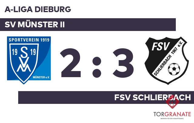Die erste Halbzeit endete ohne ein zählbares Ereignis für beide Mannschaften. Luca Steinhoff witterte seine Chance und schoss den Ball zum 1:0 für den SV Münster II ein (50.). Yannick Eckert schoss für den FSV Schlierbach in der 62. Minute das erste Tor. Für das zweite Tor des FSV Schlierbach war Benjamin Hock verantwortlich, der in der 67. Minute das 2:1 besorgte. In der 73. Minute verwandelte Lukas Schmidt einen Elfmeter zum 3:1 für den FSV Schlierbach. Timo Kreher war zur Stelle und markierte das 2:3 des SV Münster II (90.). Zum Schluss feierte der FSV Schlierbach einen dreifachen Punktgewinn gegen den Gastgeber.