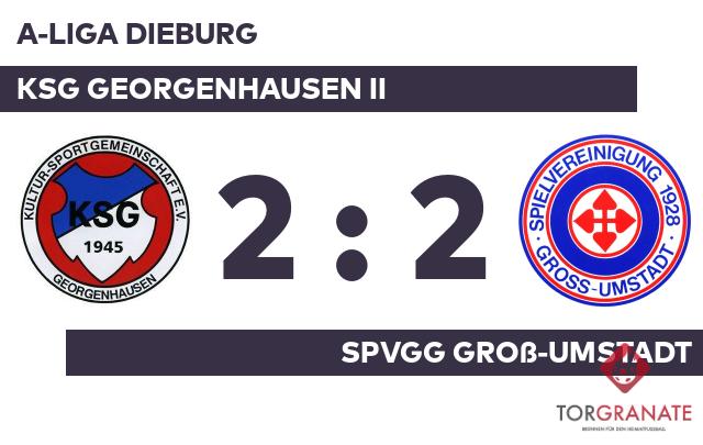 Die Gäste gerieten schon in der zehnten Minute in Rückstand, als Halil Doenmez das schnelle 1:0 für die KSG Georgenhausen II erzielte. Patrizio Batolomeo Colucci sicherte der SpVgg Groß-Umstadt nach 22 Minuten den Ausgleich durch einen Elfmeter. Das letzte Tor der turbulenten Startphase markierte Marco Groeger in der 28. Minute. Den Unterschied zwischen den beiden Mannschaften machte bis zur Pause lediglich ein Treffer aus, den die KSG Georgenhausen II für sich beanspruchte. Anstelle von Drini Sulejmani war nach Wiederbeginn Christopher Friedrich für die Gastgeber im Spiel. Gökhan Öztas versenkte den Ball in der 58. Minute im Netz der KSG Georgenhausen II. Am Ende stand ein Teilerfolg für beide Mannschaften. Die KSG Georgenhausen II und die SpVgg Groß-Umstadt spielten unentschieden.