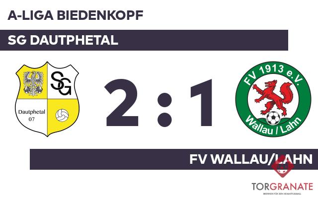 Sarwar Mohammed Taher brachte die SG Dautphetal in der 13. Minute in Front. Ehe der Referee Eric Weigel (Dautphetal) die Protagonisten zur Pause bat, traf Florian Schmidt zum 2:0 zugunsten des Gastgebers (40.). Mit der Führung für die SG Dautphetal ging es in die Halbzeitpause. Zum Seitenwechsel ersetzte Jonas Glaeser vom FV Wallau/Lahn seinen Teamkameraden Marvin Schaefer. Ein Eigentor der SG Dautphetal in der 57. Minute brachte dem FV Wallau/Lahn den 1:2-Anschluss. Obwohl der SG Dautphetal nach erfolgreicher erster Hälfte keine weiteren Tore gelangen, schaffte es der FV Wallau/Lahn zugleich nicht, die Partie zu drehen. Sie endete mit 2:1.