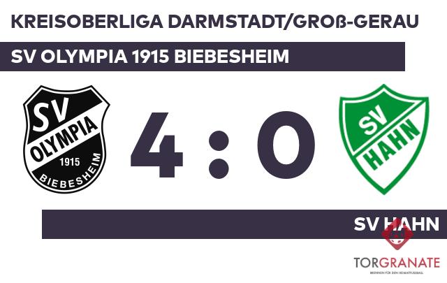 In Durchgang zwei lief Robert Schmidt anstelle von Kevin Marguardt für den Gastgeber auf. Der Unparteiische setzte mit dem Halbzeitpfiff dem torlosen Treiben auf dem Feld vorläufig ein Ende. Maximilian Koehler trug sich in der 69. Spielminute in die Torschützenliste ein. Das 3:0 für das Olympia Biebesheim stellte Maximilian Koehler sicher. In der 74. Minute traf er zum zweiten Mal während der Partie. Pascal Michel versenkte die Kugel zum 2:0 für den SV Olympia 1915 Biebesheim (74.) Nico Krause besorgte in der Schlussphase schließlich den vierten Treffer für das Olympia Biebesheim (86.). Letztlich feierte der SV Olympia 1915 Biebesheim gegen den SV Hahn nach einer überzeugenden Darbietung einen verdienten Heimsieg.