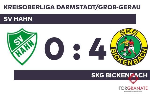 Vor dem Seitenwechsel sorgte Ole Spiecker mit seinem Treffer für eine kalte Dusche für den SV Hahn. Zur Pause war die SKG Bickenbach im Fahrwasser und verbuchte eine knappe Führung. Benedikt Saltzer verwandelte in der 59. Minute einen Elfmeter und baute den Vorsprung der Gäste auf 2:0 aus. Patrick Sturm beseitigte mit seinen Toren (73./88.) die letzten Zweifel am Sieg der SKG Bickenbach. Schlussendlich reklamierte die SKG Bickenbach einen Sieg in der Fremde für sich und wies den SV Hahn in die Schranken.