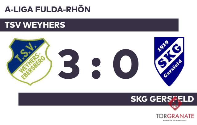 Als manch einer bereits mit den Gedanken in der Halbzeitpause war, besorgte Dennis Fischer auf Seiten des TSV Weyhers das 1:0 (42.). Der TSV führte zur Halbzeit knapp mit einem Tor Vorsprung. Luca Jehn schoss die Kugel zum 2:0 für die Weyherser über die Linie (88.). Für das 3:0 zugunsten der Ebersberger sorgte dann kurz vor Schluss Fischer, der die Gastgeber und die Fans von einer Spitzenplatzierung träumen ließ (93.). Letzten Endes ging der TSV Weyhers im Duell mit der SKG Gersfeld als Sieger hervor.