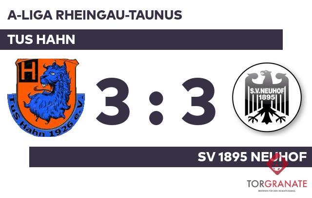 Kaum war das Spiel angepfiffen, lag der TuS Hahn bereits in Front. Christian Schleihauf markierte in der fünften Minute die Führung. Den Freudenjubel der Gastgeber machte Jan Wendler zunichte, als er kurz darauf den Ausgleich besorgte (11.). Der Treffer zum 2:1 sicherte dem TuS Hahn nicht nur die Führung – es war auch bereits der zweite von Schleihauf in diesem Spiel (22.). Das letzte Tor der turbulenten Startphase markierte Simon Falkenstein in der 25. Minute. Bis zur Pause fiel kein weiteres Tor, sodass der TuS Hahn mit einer Führung in die Kabine ging. Tom Klapproth beförderte das Leder zum 2:3 der SV Neuhof in die Maschen (51.). In der 76. Minute gelang dem Gast, was zur Pause in weiter Ferne war: der Ausgleichstreffer durch Tim David Beerenwinkel. Letztlich gingen der TuS Hahn und die SV 1895 Neuhof mit jeweils einem Punkt auseinander.