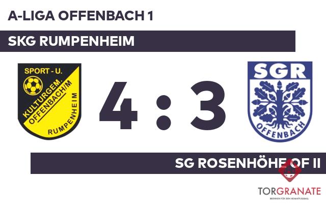 Die SKG Rumpenheim geriet schon in der vierten Minute in Rückstand, als Konstantinos Kalessios das schnelle 1:0 für die SG Rosenhöhe OF II erzielte. Lange währte die Freude der SG Rosenhöhe OF II nicht, denn schon in der zehnten Minute schoss Benjamin Maul den Ausgleichstreffer für die SKG Rumpenheim. Für Sven Wörner war der Einsatz nach 15 Minuten vorbei. Für ihn wurde Daniel Mesquita eingewechselt. Benjamin Daub brachte den Ball zum 2:1 zugunsten der SG Rosenhöhe OF II über die Linie (26.). Für das zweite Tor der SKG Rumpenheim war Moritz Meier Noorden verantwortlich, der in der 36. Minute das 2:2 besorgte. Eine Aussage darüber, wer am Ende die Nase vorn haben würde, war nach dem Abpfiff der ersten Halbzeit noch nicht zu treffen. Es ging mit einem Gleichstand in die Kabinen. In Durchgang zwei lief Damian Kolodziej anstelle von Abir Alauddin für die SG Rosenhöhe OF II auf. Zum Seitenwechsel ersetzte Ali Sarwari von der SKG Rumpenheim seinen Teamkameraden Julius Schmidt. Marc Mc Caughey machte in der 50. Minute das 3:2 der SG Rosenhöhe OF II perfekt. Die SKG Rumpenheim zeigte sich unbeeindruckt und so drehten Maik Kramer (65.) und Benjamin Hingst (87.) mit ihren Treffern das Spiel. Als Schiedsrichter Helmut Müller (Steinau an der Straße) die Partie abpfiff, reklamierte der Gastgeber schließlich einen 4:3-Heimsieg für sich.