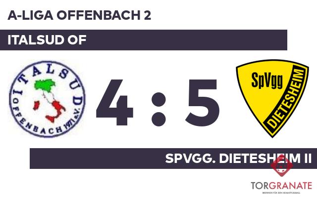 Kaum war das Spiel angepfiffen, lag das Italsud OF bereits in Front. Marko Bosnjak markierte in der vierten Minute die Führung. Enis Kelmendi witterte seine Chance und schoss den Ball zum 1:1 für die Spvgg. Dietesheim II ein (18.). Mit einem schnellen Doppelpack (37./40.) zum 3:1 schockte Joshua Jung das Italsud OF. Es folgte der Anschlusstreffer für den Gastgeber – bereits der zweite für Bosnjak. Nun stand es nur noch 2:3 (41.). Die Pausenführung der Spvgg. Dietesheim II fiel knapp aus. Das 4:2 für die Gäste stellte Kelmendi sicher. In der 51. Minute traf er zum zweiten Mal während der Partie. Mit dem dritten Treffer von Bosnjak rückte das Italsud OF wieder ein wenig an die Spvgg. Dietesheim II heran (66.). Refa Ullrich beförderte das Leder zum 5:3 der Spvgg. Dietesheim II über die Linie (79.). Kurz vor Ultimo war noch Dimitrios Tzimas zur Stelle und zeichnete für das vierte Tor des Italsud OF verantwortlich (82.). Die 4:5-Heimniederlage des Italsud OF war Realität, als Schiedsrichter Birani Achraf (Frankfurt am Main) die Partie letztendlich abpfiff.