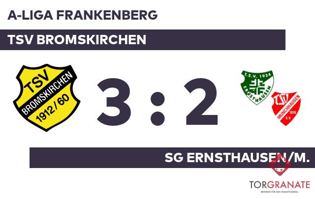 Ein frühes Ende hatte das Spiel für Florian Henry vom TSV Bromskirchen, der in der dritten Minute vom Platz musste und von Nando Majewski ersetzt wurde. Für das erste Tor des Heimteams war Jan Luca Müller verantwortlich, der in der 28. Minute das 1:0 besorgte. Der Schiedsrichter schickte schließlich beide Mannschaften ohne weitere Änderung am Spielstand in die Kabinen. Beim TSV Bromskirchen kam Philipp Jahn für Majewski ins Spiel und sollte fortan für neue Impulse sorgen (61.). In der 63. Minute erzielte Toni Knipschild das 1:1 für die SG Ernsthausen/M. Jahn brachte den Gast per Doppelschlag ins Hintertreffen, als er in der 66. und 78. Minute vollstreckte. Timo Thumberger verkürzte für die SG Ernsth./Münchh. später in der 89. Minute auf 2:3. Am Schluss siegte der TSV Bromskirchen gegen die SG Ernsthausen/M.