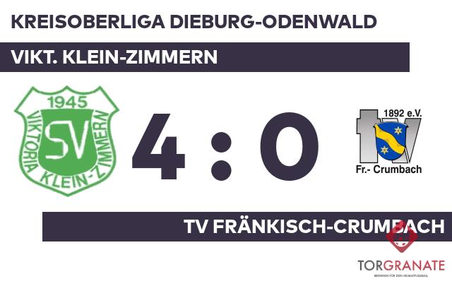 Steven Baader stellte die Weichen für die Vikt. Klein-Zimmern auf Sieg, als er in Minute 13 mit dem 1:0 zur Stelle war. Finn Schuetz verwandelte in der 45. Minute einen Elfmeter und baute den Vorsprung der Gastgeber auf 2:0 aus. Mit der Führung für die Vikt. Klein-Zimmern ging es in die Halbzeitpause. Beim TV Fr.-Crumbach kam zu Beginn der zweiten Hälfte Steffen Zeisel für Pascal Trizzino in die Partie. Baader beseitigte mit seinen Toren (66./76.) die letzten Zweifel am Sieg der Vikt. Klein-Zimmern. Letztlich kam die Vikt. Klein-Zimmern gegen den TV Fränkisch-Crumbach zu einem verdienten 4:0-Sieg.