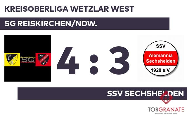 Die SG Reiskirchen/Ndw. geriet schon in der sechsten Minute in Rückstand, als Chirom Buhl das schnelle 1:0 für den SSV Sechshelden erzielte. Julian Bäuerle witterte seine Chance und schoss den Ball zum 1:1 für die SG Reiskirchen/Ndw. ein (23.). Dennis Brandenburger versenkte die Kugel zum 2:1 (27.). Die SG Reiskirchen/Ndw. zeigte sich unbeeindruckt und so drehten Christian Blum (34.) und Bäuerle (39.) mit ihren Treffern das Spiel. Zur Pause war das Heimteam im Fahrwasser und verbuchte eine knappe Führung. In der 66. Minute war Buhl mit dem Ausgleich zum 3:3 zur Stelle. Damit schoss er bereits seinen zweiten Treffer! Gefeierter Mann des Spiels war Bäuerle, der der SG Reiskirchen/Ndw. mit seinem Treffer in der 88. Minute den Vorsprung brachte. Letzten Endes holte die SG Reiskirchen/Ndw. gegen den SSV Sechshelden drei Zähler.
