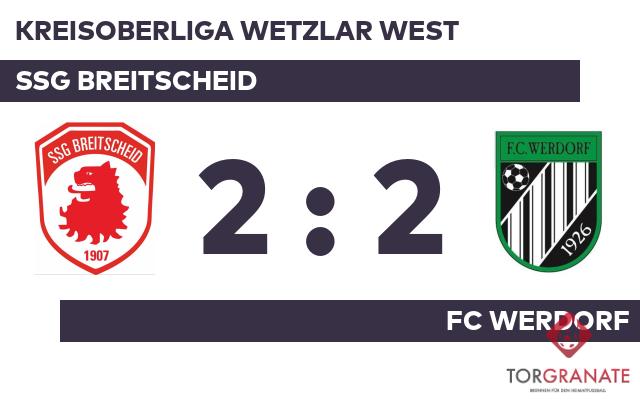 Auf die vermeintliche Siegerstraße brachte Rene Knoll sein Team in der zweiten Minute. Der FC Werdorf führte zur Halbzeit knapp mit einem Tor Vorsprung. In Durchgang zwei lief Jannis Göbel anstelle von Andreas Gerlitz für die SSG Breitscheid auf. Mit dem Tor zum 2:0 steuerte Knoll bereits seinen zweiten Treffer an diesem Tag bei (52.). In der 59. Minute brachte Torben Weyel den Ball im Netz des FC Werdorf unter. Für den späten Ausgleich war Jannis Maximilian Wader verantwortlich, der in der 80. Minute zur Stelle war. Nach einer deutlichen Führung wähnte der FC Werdorf die Schäfchen bereits im Trockenen. Doch die SSG Breitscheid stemmte sich gegen die drohende Niederlage und holte am Ende noch ein Remis.