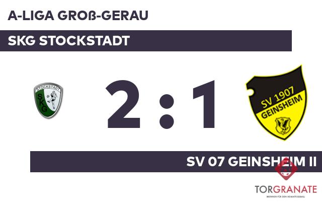 Auf die vermeintliche Siegerstraße brachte Elias Hahn sein Team in der 15. Minute. In der 29. Minute erzielte Alexander Fiedler das 1:1 für die SKG Stockstadt. Ausgerechnet zum psychologisch ungünstigen Zeitpunkt vor der Halbzeit traf Roberto Riggio für das Heimteam zur Führung (43.). Obwohl der SKG Stockstadt nach erfolgreicher erster Hälfte keine weiteren Tore gelangen, schaffte es der SV 07 Geinsheim II zugleich nicht, die Partie zu drehen. Sie endete mit dem Halbzeitstand von 2:1.