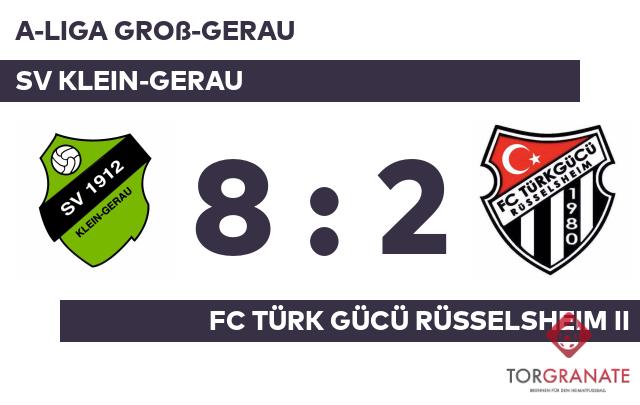 Der SV Klein-Gerau ging durch Emre Kanmaz in der 17. Minute in Führung. Salvatore Aiuto schoss die Kugel zum 2:0 für die Gastgeber über die Linie (20.). Doppelpack für den SV Klein-Gerau: Nach seinem ersten Tor (25.) markierte Soufiane Choukairi wenig später seinen zweiten Treffer (29.). Tim Baatz traf zum 1:4 zugunsten des FC Türk Gücü Rüsselsheim II (31.). Gianluca la Pietra überwand den gegnerischen Schlussmann zum 5:1 für den SV Klein-Gerau (36.). Mit dem Tor zum 6:1 steuerte Kanmaz bereits seinen zweiten Treffer an diesem Tag bei (38.). Anstelle von Muecahit Akpinar war nach Wiederbeginn Hasan Mete Celiker für TG Rüsselsheim II im Spiel. Der SV Klein-Gerau dominierte das Geschehen in Durchgang eins nach Belieben und schenkte dem FC Türk Gücü Rüsselsheim II bis zur Pause einen drückenden Rückstand ein. Nadir Yildiz versenkte den Ball in der 51. Minute im Netz des SV Klein-Gerau. Das 8:2 für den SV Klein-Gerau stellte Kanmaz sicher. In der 52. Minute traf er zum dritten Mal während der Partie. Mit dem Spielende fuhr der SV Klein-Gerau einen Kantersieg ein. Bereits vor dem Seitenwechsel war für TG Rüsselsheim II klar, dass gegen den SV Klein-Gerau heute kein Kraut gewachsen war.