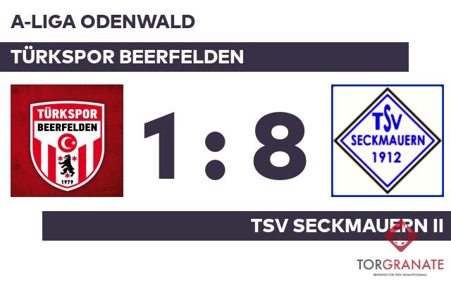 David Raitz brachte den Gast in der 22. Minute nach vorn. Bis zur Pause fiel kein weiteres Tor, sodass der TSV Seckmauern II mit einer Führung in die Kabine ging. Dennis Calis beförderte das Leder zum 2:0 des TSV Seckmauern II über die Linie (47.). Mit dem Tor zum 3:0 steuerte Raitz bereits seinen zweiten Treffer an diesem Tag bei (51.). Onur Sahin witterte seine Chance und schoss den Ball zum 1:3 für Türkspor Beerfelden ein (52.). Mit weiteren Toren von Moritz Spall (57.), Christian Verst (64.) und Calis (73.) stellte der TSV Seckmauern II den Stand von 6:1 her. Mit zwei schnellen Treffern von Silvano Calo (81.) und Calis (87.) machte der TSV Seckmauern II deutlich, dass mit diesem Angriff jederzeit zu rechnen ist. Der TSV Seckmauern II überrannte Türkspor Beerfelden förmlich mit acht Toren und fährt so mit einem verdienten Sieg in der Tasche nach Hause.