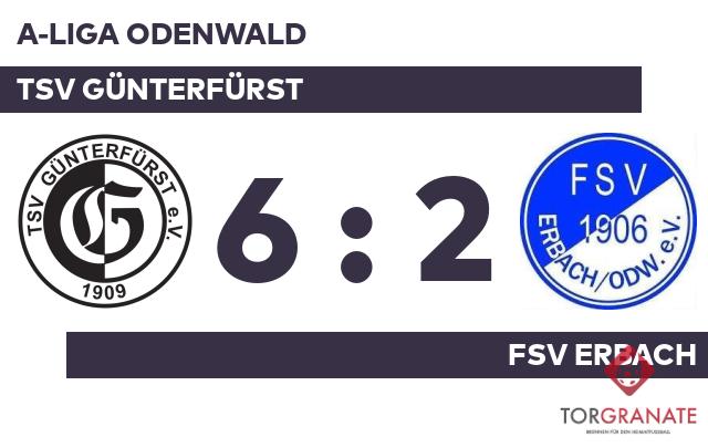 Die Heimmannschaft ging durch Maximilian Henkes in der siebten Minute in Führung. Bereits in der elften Minute erhöhte Tobias Hastert den Vorsprung des TSV Günterfürst. Robin Mueller vollendete zum dritten Tagestreffer in der 15. Spielminute. Kurz vor dem Seitenwechsel legte Matthias Hallstein das 4:0 nach (41.). Nach dem souveränen Auftreten des TSV Günterfürst überraschte es kaum einen Zuschauer, dass zur Pause eine deutliche Führung stand. Für das 1:4 des FSV Erbach zeichnete Fatih Sevindik verantwortlich (47.). Mit dem 5:1 von Louis Timocin für den TSV Günterfürst war das Spiel eigentlich schon entschieden (57.). Justin Niederhaus war es, der in der 59. Minute das Spielgerät im Gehäuse des TSV Günterfürst unterbrachte. Timocin stellte schließlich in der 84. Minute den 6:2-Sieg für den TSV Günterfürst sicher. Schlussendlich verbuchte der TSV Günterfürst gegen den FSV Erbach einen überzeugenden Heimerfolg.