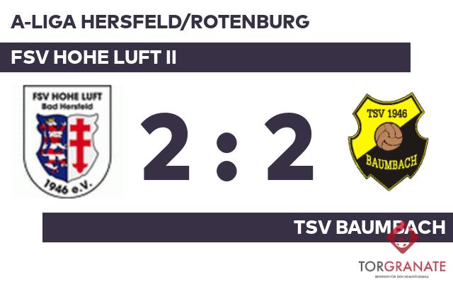 Torlos ging es zur Halbzeitpause in die Kabinen. Mathias Brethauer ersetzte zu Beginn der zweiten Halbzeit beim TSV Baumbach Tobias Fischer. Beide sind für die gleiche Position nominiert. Beim FSV Hohe Luft II kam zu Beginn der zweiten Hälfte Ron Seifert für Felix Hildebrand in die Partie. Niklas Hafner brachte den FSV in der 51. Minute nach vorn. Ab der 56. Minute bereicherte der für Timo Reidt eingewechselte Samuel Taddese die Hersfelder im Vorwärtsgang. Dumezweni Sibanda erhöhte für den Gastgeber auf 2:0 (63.). Torben Bämpfer verkürzte für den TSV Baumbach später in der 72. Minute auf 1:2. Für den späten Ausgleich war Hendrik Becker verantwortlich, der in der 81. Minute zur Stelle war. Alles sprach für einen Sieg des FSV Hohe Luft II, doch am Ende wurde das Aufbäumen des TSV Baumbach noch belohnt, und die Teams trennten sich mit einem Remis voneinander.