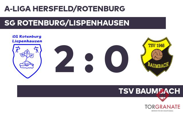 Die erste Halbzeit endete ohne ein zählbares Ereignis für beide Mannschaften. Für den Führungstreffer von Rotenburg/Lispenh. zeichnete Florian Goetzke verantwortlich (55.). Der für Steffen Kanngießer ins Spiel gekommene Rene Steinhauer sollte in der Offensive ein Zeichen setzen (60.). Steinhauer stellte wenige Minuten vor dem Schlusspfiff den Stand von 2:0 für die SG Rotenburg/Lispenhausen her (87.). Am Schluss fuhr Rotenburg/Lispenh. gegen den TSV Baumbach auf eigenem Platz einen Sieg ein.