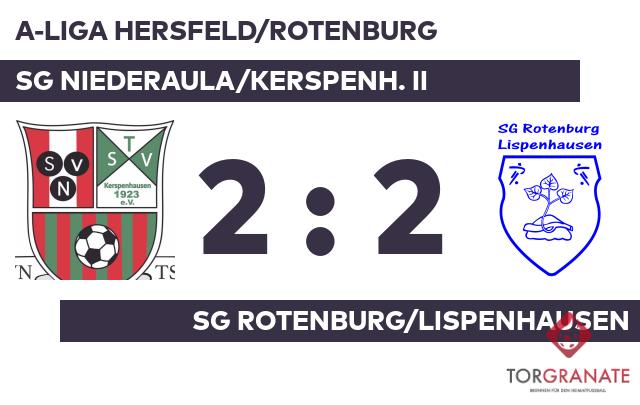 Steffen Kanngießer schoss in der zehnten Minute vom Elfmeterpunkt das erste Tor des Spiels für die SG Rotenburg/Lispenhausen. Daniel Hanke nutzte die Chance für die SG Niederaula/Kerspenh. II und beförderte in der 24. Minute das Leder zum 1:1 ins Netz. Ohne dass sich am Stand noch etwas tat, schickte Schiedsrichter Sebastian Dücker (Bad Salzschlirf) die Akteure in die Pause. Bei Rotenburg/Lispenh. ging in der 51. Minute der etatmäßige Keeper Maurice Reyer raus, für ihn kam Gino Oglialoro. Rifat Yildiz, der von der Bank für Max Bodes kam, sollte für neue Impulse bei Niederaula/Kersp. II sorgen (69.). Für das 2:1 der Heimmannschaft zeichnete Yildiz verantwortlich (78.). Florian Goetzke, der in der 85. Minute erfolgreich war, sorgte mit seinem Treffer kurz vor dem Spielende für den Ausgleich. Am Ende stand es zwischen der SG Niederaula/Kerspenh. II und der SG Rotenburg/Lispenhausen pari.