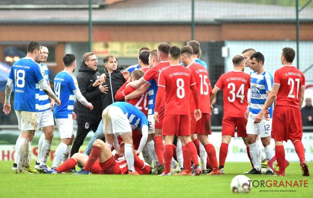 Nach dem Seitenwechsel wurde es dann richtig hitzig. Marc Röhrig rauschte von hinten mit gestrecktem Bein in Patrick Broschke rein, Rot war die absolut richtige Entscheidung. Es folgte eine Rudelbildung mit beiden Trainern und zahlreichen Spielern, Buchonen-Coach Zlatko Radic musste hinter die Barriere, Patrick Schaaf, der Sünder Götze hart angegangen hatte, war mit Gelb-Rot noch gut bedient.