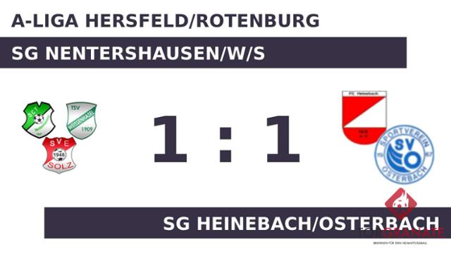 Nach den ersten 45 Minuten ging es für die SG Nentershausen/W/S und Heinebach/Osterbach ohne Torerfolg in die Kabinen. Pascal Mangold brach für die SG NWS den Bann und markierte in der 63. Minute die Führung. Den Freudenjubel der Dreier-Spielgemeinschaft machte Jonas Dick zunichte, als er kurz darauf den Ausgleich besorgte (67.). Letzten Endes wurde im Aufeinandertreffen der SG Nentershausen/W/S mit der SG Heinebach/Osterbach kein Sieger ermittelt.