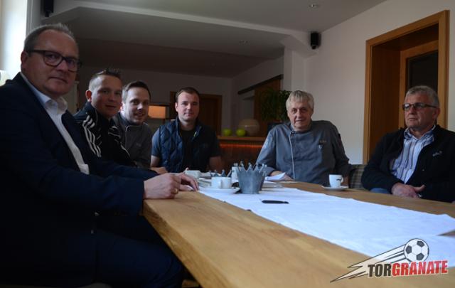 Thorsten Diemer (Vorstand SV Tann), Marcel Kessler (Trainer des B-Liga-Teams), Benjamin Kehl (Kapitän des KOL-Teams), Matthias Heim (zukünftiger Trainer des KOL-Temas), Dieter Kehl (Führungsteam der Spielgemeinschaft) und Norbert Müller (Vorstand SV Lahrbach). Foto: Johannes Götze