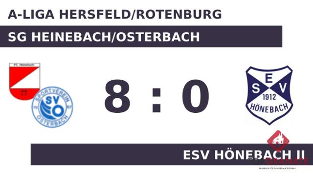 Durch den nie gefährdeten Sieg gegen ESV Hönebach II festigte Heinebach/Osterbach den zweiten Tabellenplatz. 45 Tore – mehr Treffer als die SG Heinebach/Osterbach erzielte kein anderes Team der A-Liga Hersfeld/Rotenburg. Die bisherige Spielzeit der Spielgemeinschaft ist weiter von Erfolg gekrönt. Der Gastgeber verbuchte insgesamt neun Siege und ein Remis und musste erst zwei Niederlagen hinnehmen. In den letzten fünf Partien rief Heinebach/Osterbach konsequent Leistung ab und holte zwölf Punkte.